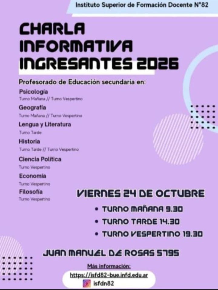 Los/as invitamos a la CHARLA INFORMATIVA PARA INGRESANTES 2026, para conocer más acerca de nuestra oferta académica y resolver cualquier duda que tengan. La charla se realizará el día viernes 24 DE OCTUBRE en la sede Rosas (Brig. Juan Manuel de Rosas 5795) en los tres turnos: 🔸️Turno mañana 09.30 hs.🔸️Turno tarde 14.30 hs.🔸️Turno vespertino … [+]