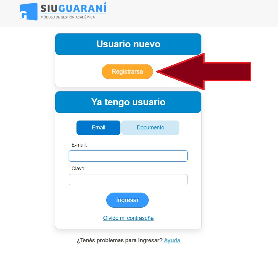 1- Deberán ingresar en el botón de «Registrarse» para poder darse de alta como usuario en el Sistema.